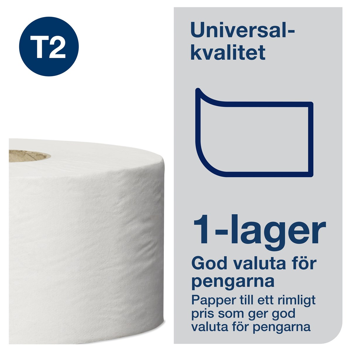 Ofärgat, 1-lags toalettpapper i baskvalitet (Universal). Perforerat. 240 m/rulle. 12 rl/förp. Passar till Tork hållare T2.