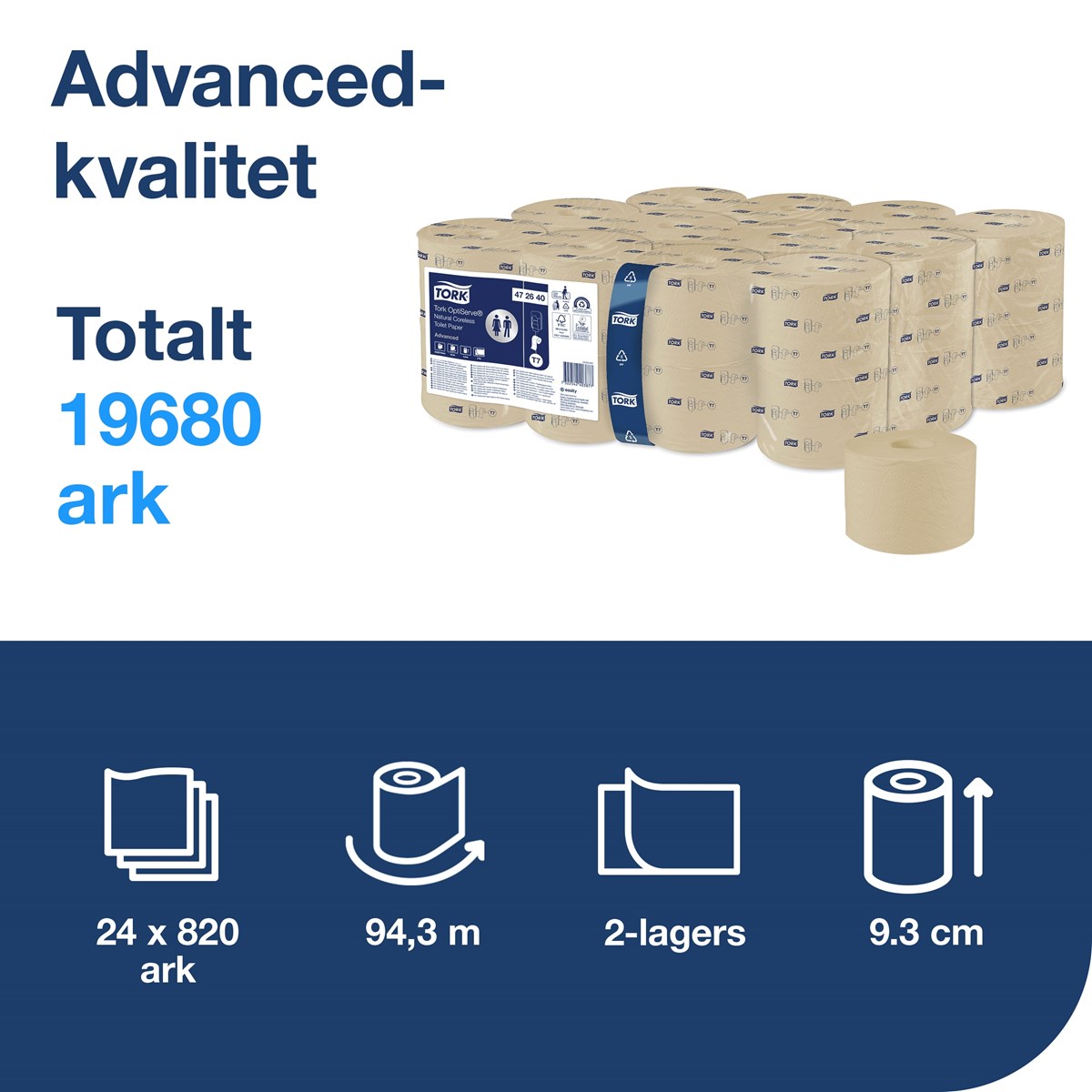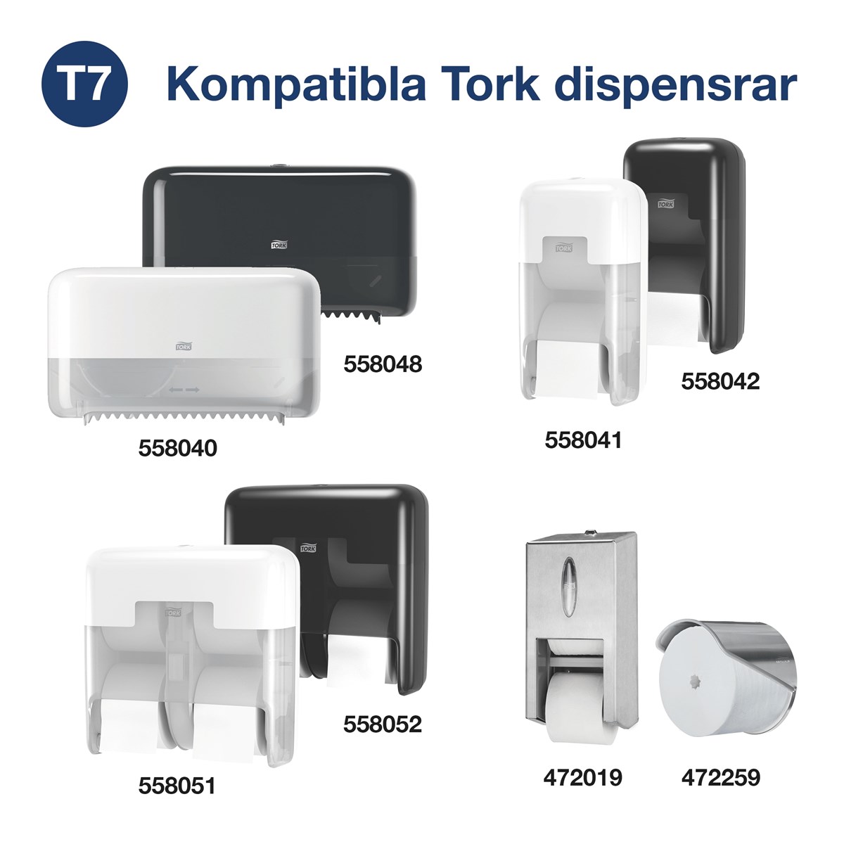 24 rullar/förp. 2-lagers. Advanced-kvalitet. Storlek på rulle: D 94.3 m, B 9.3 cm. Arkets längd: 11.5 cm. Passar med T7 dispensrar.