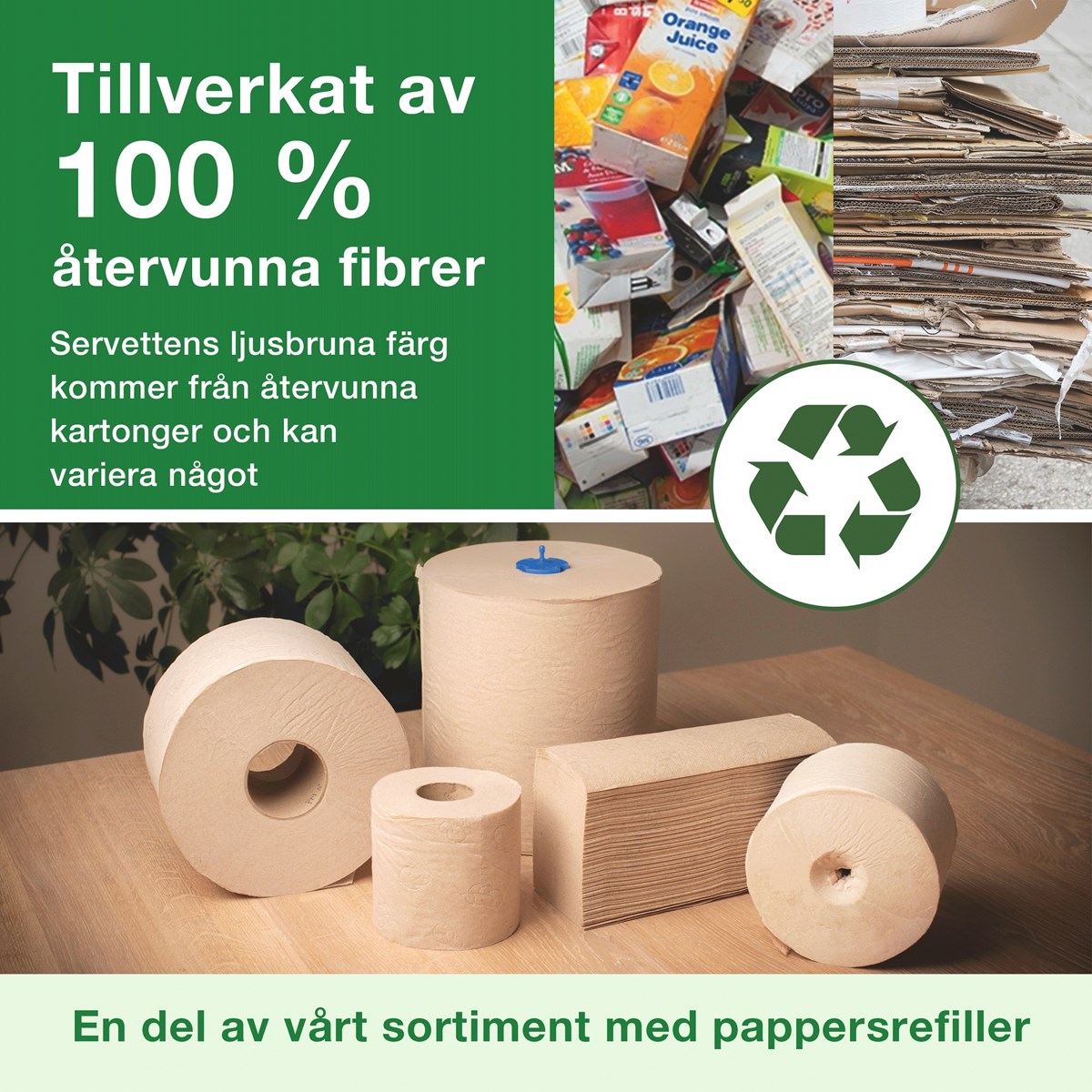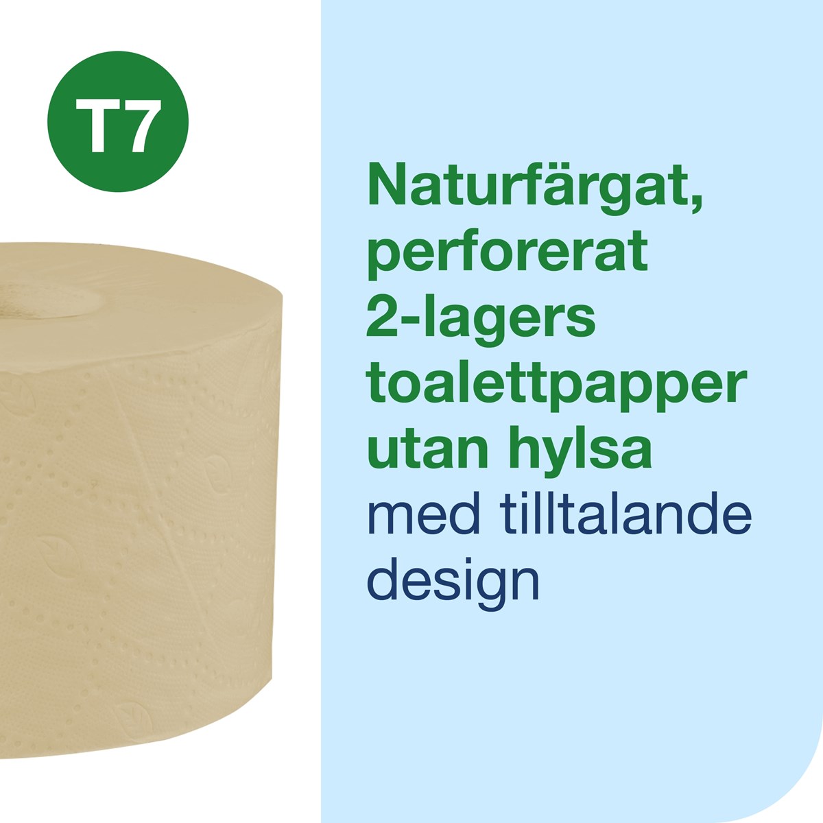 Perforerat 2-lagers toalettpapper utan hylsa 100 % återvunna fibrer Den naturligt ljusbruna färgen kommer från återvunnen kartong som en av fiberkällorna Kompakta rullar med 3 gånger mer papper Varken hylsa eller omslag innebär mindre avfall