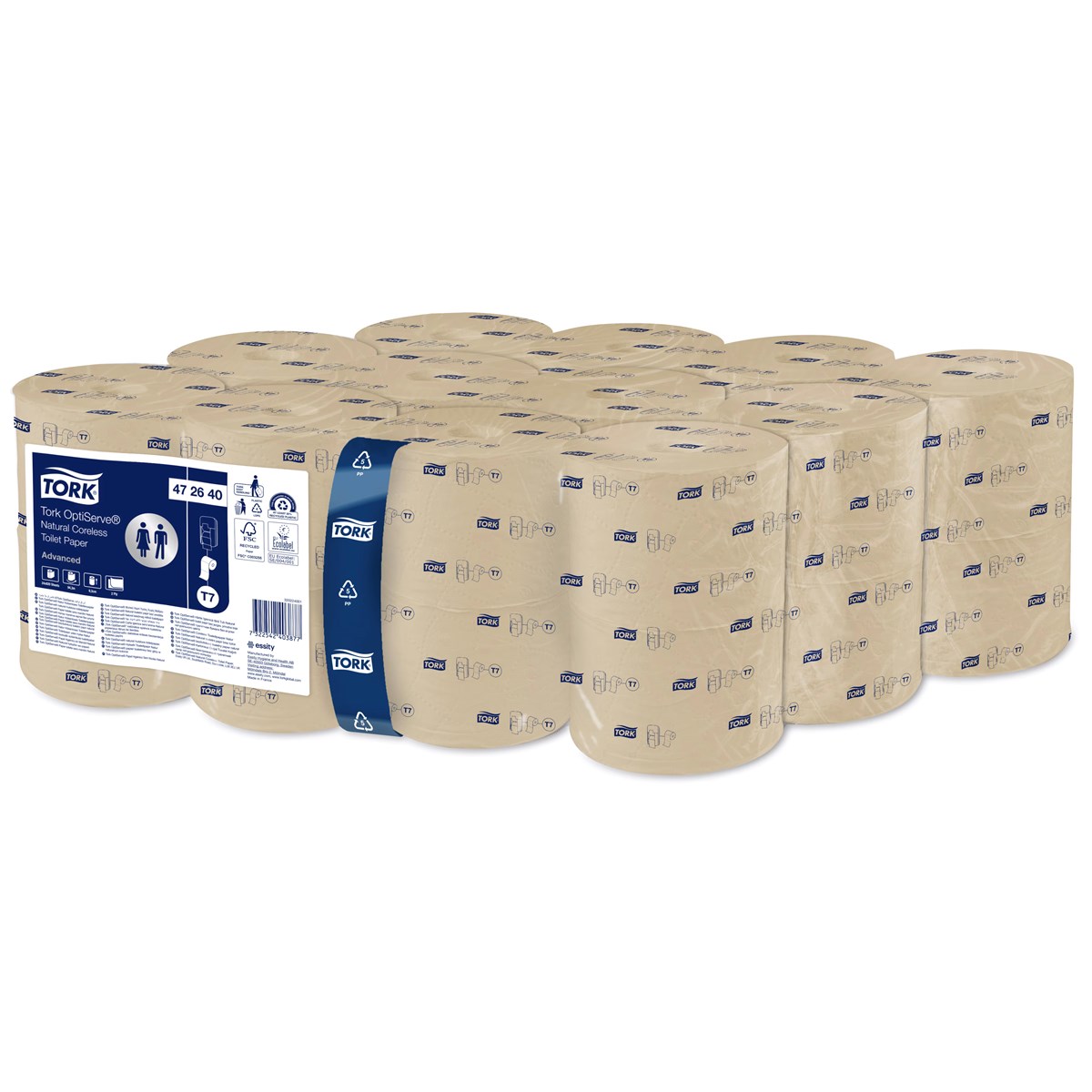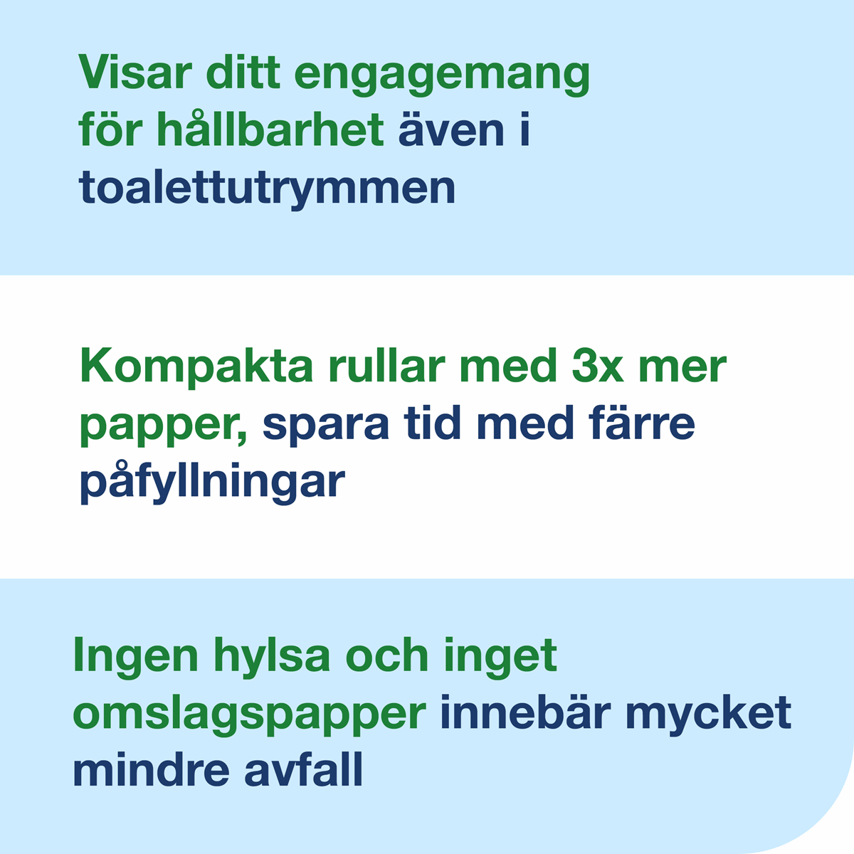 Tork OptiServe® Coreless är ett system med hög kapacitet för toalettpapper utan hylsa som passar anläggningar där effektivitet, hållbarhet och en utmärkt upplevelse är av största vikt. Hög kapacitet, minskad förvaringsplats och en design som är Easy to use-certifierad gör det till ett bättre alternativ än vanligt toalettpapper och jumborullar. Dessa 2-lagers toalettrullar utan hylsa passar en rad olika dispensrar för toalettpapper utan hylsa för att möta behoven i olika toalettutrymmen, så att samma kompakta refiller för toalettpapper kan användas i hela anläggningen. Jämfört med vanligt toalettpapper rymmer Tork OptiServe® Coreless rullar 3 gånger mer papper eftersom de varken har hylsa eller omslag, vilket innebär mindre avfall.